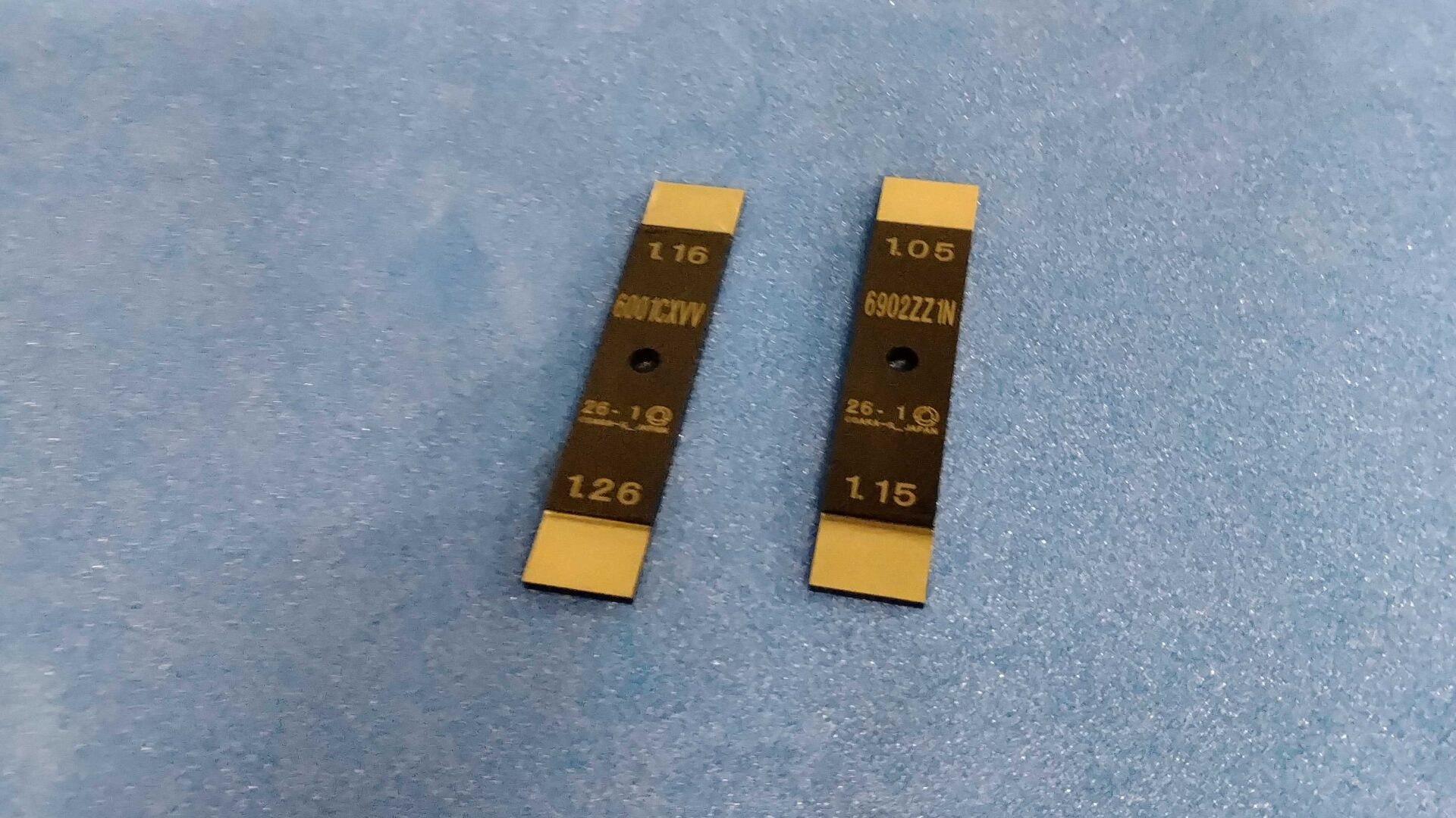 軸受の止め金用に加工するN溝測定用の限界ゲージです。限界ゲージというは、比較測定器の一種に分類されますが、検査規格の上・下限値の「通りゲージ」と「止まりゲージ」を用意して、通りゲージが入って、止まりゲージが入らなければ合格と判定するためのゲージです。