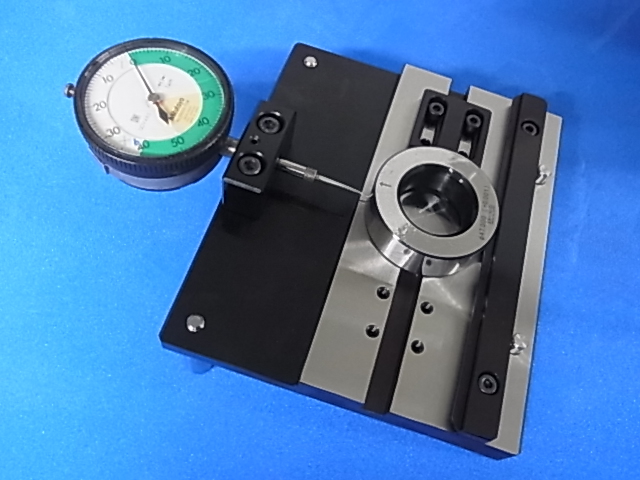 通常の外径測定器はワークの下側の基準板とダイヤル端子側の2点で外径を測定しますが(ダイヤルの最大値=外径)、この測定器は横方向からガイドを設置し、そこでもワークを支持します。こうすることによって、「直径と真円形状を同時に測定したい」というユーザーの要望にお応えした測定器です。